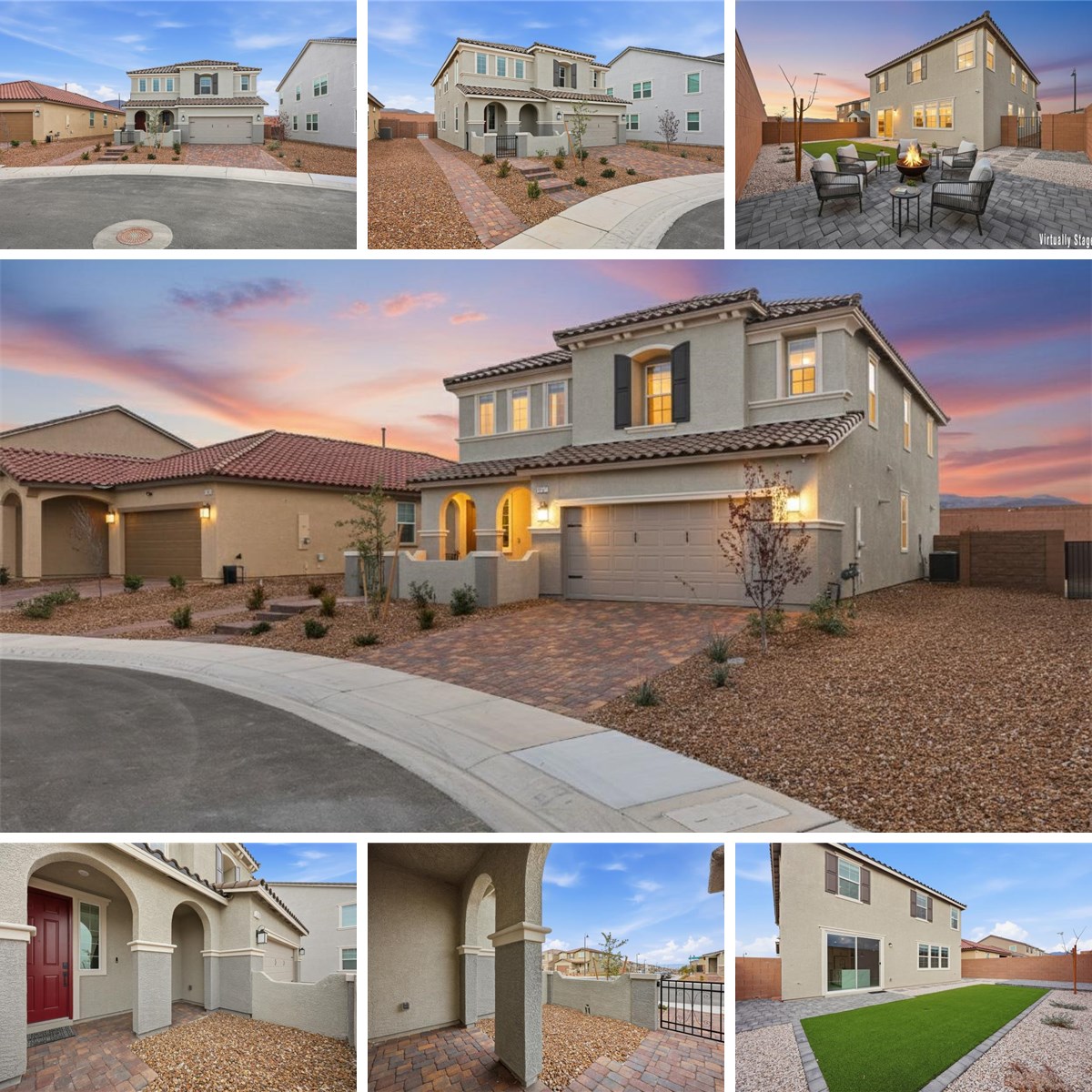 Luxury meets lifestyle in this nearly new home with stunning, unobstructed mountain views and a view of the Las Vegas Strip. With 3,063 sq ft, this beautifully upgraded home features 5 spacious bedrooms, a versatile loft/game room, and 3.5 baths. The chef’s kitchen is a showstopper with stainless steel appliances, double ovens, 4-burner cooktop with hood, quartz counters, backsplash, waterfall island with breakfast bar, cabinets with pull-outs, a walk-in pantry, and a reverse osmosis system. The expansive great room is ideal for entertaining with linear fireplace, and view windows of the beautiful backyard. The grand primary suite offers a double-door entry, walk-in closet with custom built-ins, dual sinks, soaking tub, and separate shower. Large secondary bedrooms, 4 of them with walk-in closets, plus a downstairs ensuite ideal for guests. One of the upstairs bedrooms has been thoughtfully transformed into a custom home office, complete with a sleek built-in desk system. Thoughtful upgrades throughout include custom lighting and plumbing fixtures, water softener, security system, keyless entry, smart thermostats, gated front courtyard, a laundry room with cabinetry and plumbed for a sink. The private backyard is designed for both relaxation and entertaining, featuring brick paver patio, low-maintenance landscaping, and no rear neighbor—just endless mountain views.